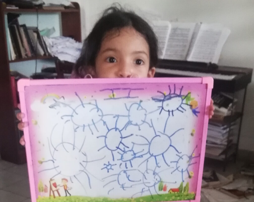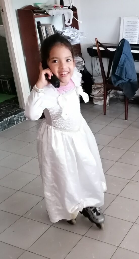 Den lille (Linet på fem år) har derudover sine daglige telefonsamtaler med børnehaveklasseveninden Mariana, og disse samtaler strækker sig over en time, hvor de finder på lege i hver sin ende af telefonen: udklædning, tegne, spille computer, opdigte sange eller historier om superheltinder (inspiration fra nogle japanske tegnefilm). De har utrolig megen fantasi, de to piger.